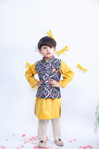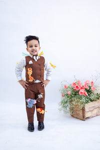 Boys White Shirt With Brown Waist Coat And Pant With Animals Motifs